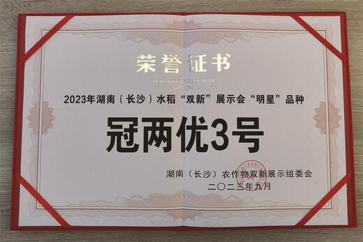 2023年9月 獲評2023年湖南(長沙)水稻“雙新”展示會“明星”品種