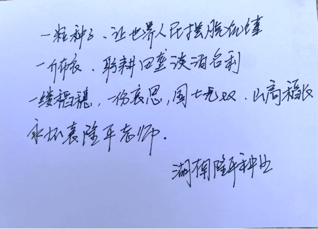 “勇擔使命、敢于挑戰、不服輸”的偉人基因,隆平人也將進一步學習袁老甘于奉獻、腳踏實地,躬耕于祖國大地上的優良品質,弘揚隆平精神,踐行“造福 共贏 創新 進取”核心價值觀,沿著袁老足跡,光大隆平事業,推動雜交水稻產業高質量發展,再續“隆平夢”。