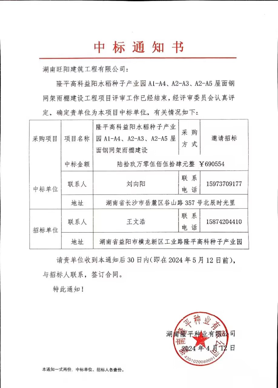 隆平高科益陽水稻種子產業園 A1-A4、A2-A3、A2-A5屋面鋼網架雨棚建設工程 中標通知書