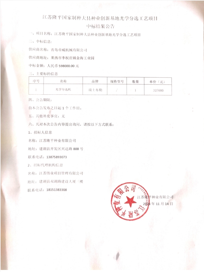 江蘇隆平國家制種大縣種業創新基地光學分選工藝項目中標結果公告