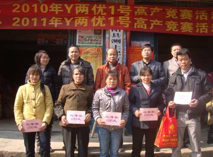 當(dāng)天,參加頒獎(jiǎng)活動(dòng)儀式的除了當(dāng)?shù)厝罕姾瞳@獎(jiǎng)農(nóng)戶外,還有附近三個(gè)鄉(xiāng)的零售商和農(nóng)戶代表、分管農(nóng)業(yè)的鎮(zhèn)領(lǐng)導(dǎo)、百色市農(nóng)產(chǎn)品檢測中心、土肥站、推廣站等。隨著主持人宣布活動(dòng)開始的聲音,獲獎(jiǎng)的農(nóng)戶自發(fā)燃起了鞭炮。獲二等獎(jiǎng)的韋信吉農(nóng)戶更是抓起話筒,當(dāng)場向在場群眾介紹種植Y兩優(yōu)1號(hào)的經(jīng)驗(yàn),特別說到:Y兩優(yōu)1號(hào)不緊產(chǎn)量高,抗性好,Y兩優(yōu)1號(hào)的大米也比其它品種多賣0.3元/斤。