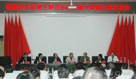 9月19日下午, 超級雜交稻第三期目標攻關重大突破記者見面會在湖南雜交水稻研究中心舉行。雜交水稻之父袁隆平院士,農業部驗收組組長、中國水稻所所長程式華,湖南省農業廳總農藝師劉年喜,湖南省農科院黨委書記何鐵林、院長鄒學校,隆回縣委書記鐘義凡參加了記者見面會。見面會由湖南省政府新聞辦公室新聞發布處處長陽芳菲主持。