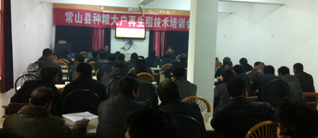 2月21日上午,受到常山縣農業局邀請,我公司作為唯一企業單位參加常山縣種糧大戶再生稻技術培訓會,由農業局副局長黃道龍主持,我公司栽培專家郭守斌老師主講,農辦副主任洪小峰、常山縣水稻研究所所長何水清、全縣60多名種糧大戶參加了此次培訓會,、