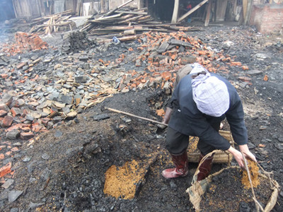 下車,與同事慢慢踏過那被大火焚燒過的土地,踏著炭化的木屑、破碎的瓦礫,前方一位老婦吸引了我的目光,她們正彎腰認真地徒手在廢墟中掏著什么,走近一看,被掏在筐子里的,有被炭化了或是還保持著金黃色的稻谷,可能,這曾經是她們的糧倉。“掏出來還有什么用么?”我有些好奇的問,“可以喂雞喂鴨!”老婦很熱情的回答著。走過每一片土地,我舉著相機靜靜地拍攝,眼前都是友好、平和的眼神,想來,侗族的老鄉已經度過了最艱難的時候,他們能感受到眾多來自千里萬里的愛心與溫暖。