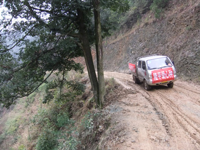 3月1日上午,在與通道縣縣政府、農業局相關領導匯合之后,裝載著愛心種,我們上路了。通道到獨坡鄉鄉政府,花了1個半小時;從鄉政府再到新豐、駱團村,僅僅只有20余公里的路程,卻足足花了1個多小時。蜿蜒而上的盤山公路,一邊是陡峭的山崖,一邊是深深的泥濘,走走停停,不時還可以看到維護山路的路政人員。
