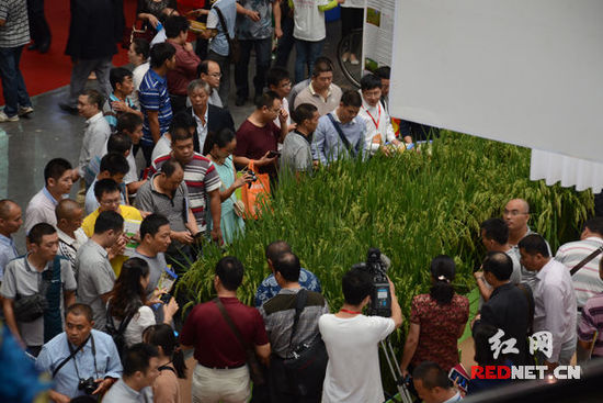 (湖南隆平高科將超級雜交稻的樣品從田間搬到展會現場,受到各參展商和市民的圍觀。)