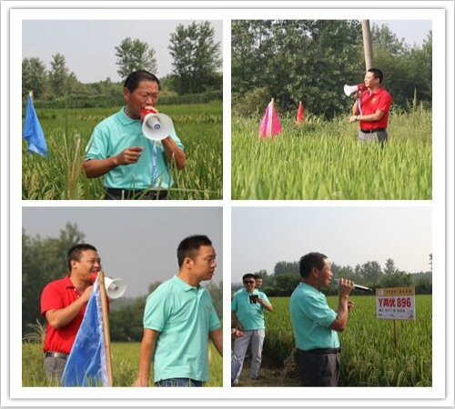 30日早上八點(diǎn)半,車隊(duì)準(zhǔn)時(shí)到達(dá)室外會(huì)場(chǎng),李總和張站長(zhǎng)在田間為客戶介紹Y兩優(yōu)896百畝示范片的栽培管理水平及特征特性。
